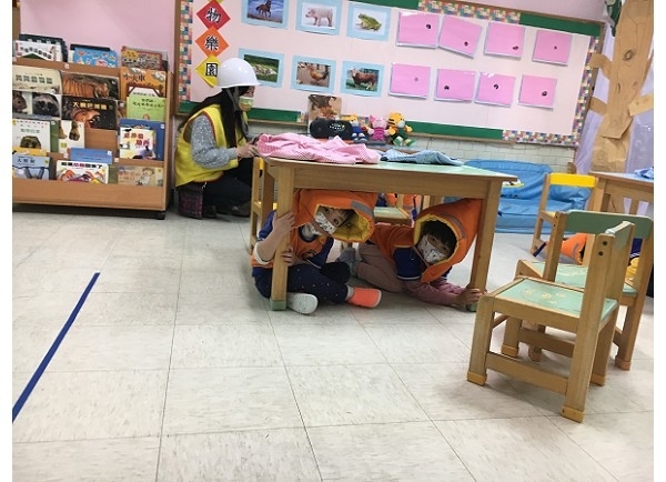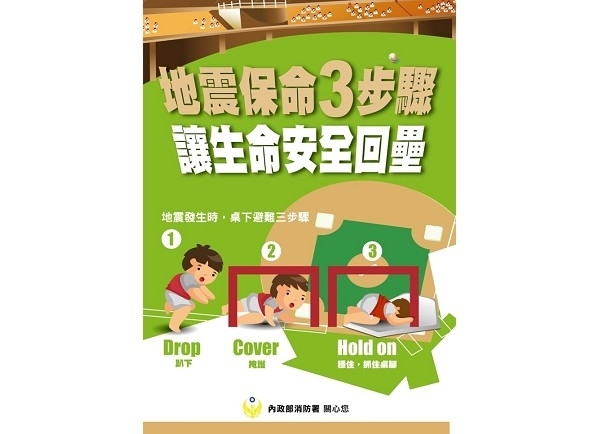 地震發生的時候最重要的就是保護頭部、頸部避免受傷,應立即採「趴下、掩護、穩住」的動作,躲在桌下或是牆角,躲在桌子下時可握住桌腳,當桌子隨地震移動時,桌下的人也可隨著桌子移動,形成防護屏障,避免受傷,如果是躲在牆角或柱子旁邊等地方避難時,要小心家具、電器、燈具、書櫃或貨架等。